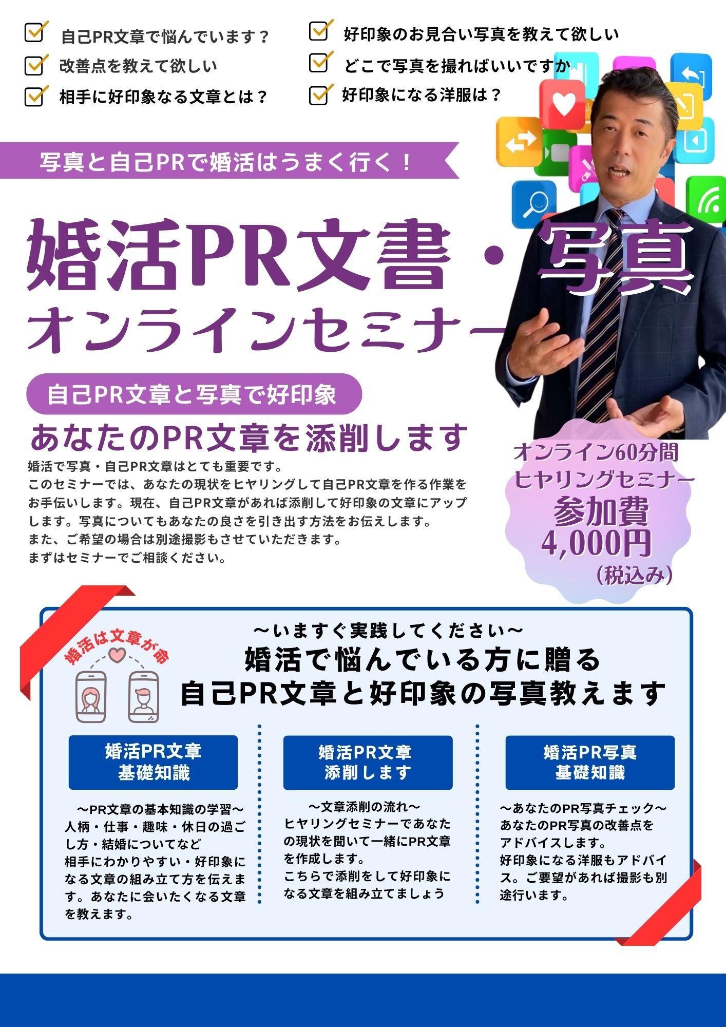 婚活で写真・自己PR文章はとても重要です。このセミナーでは、あなたの現状をヒヤリングして自己PR文章を作る作業をお手伝いします。現在、自己PR文章があれば添削して好印象の文章にアップします。